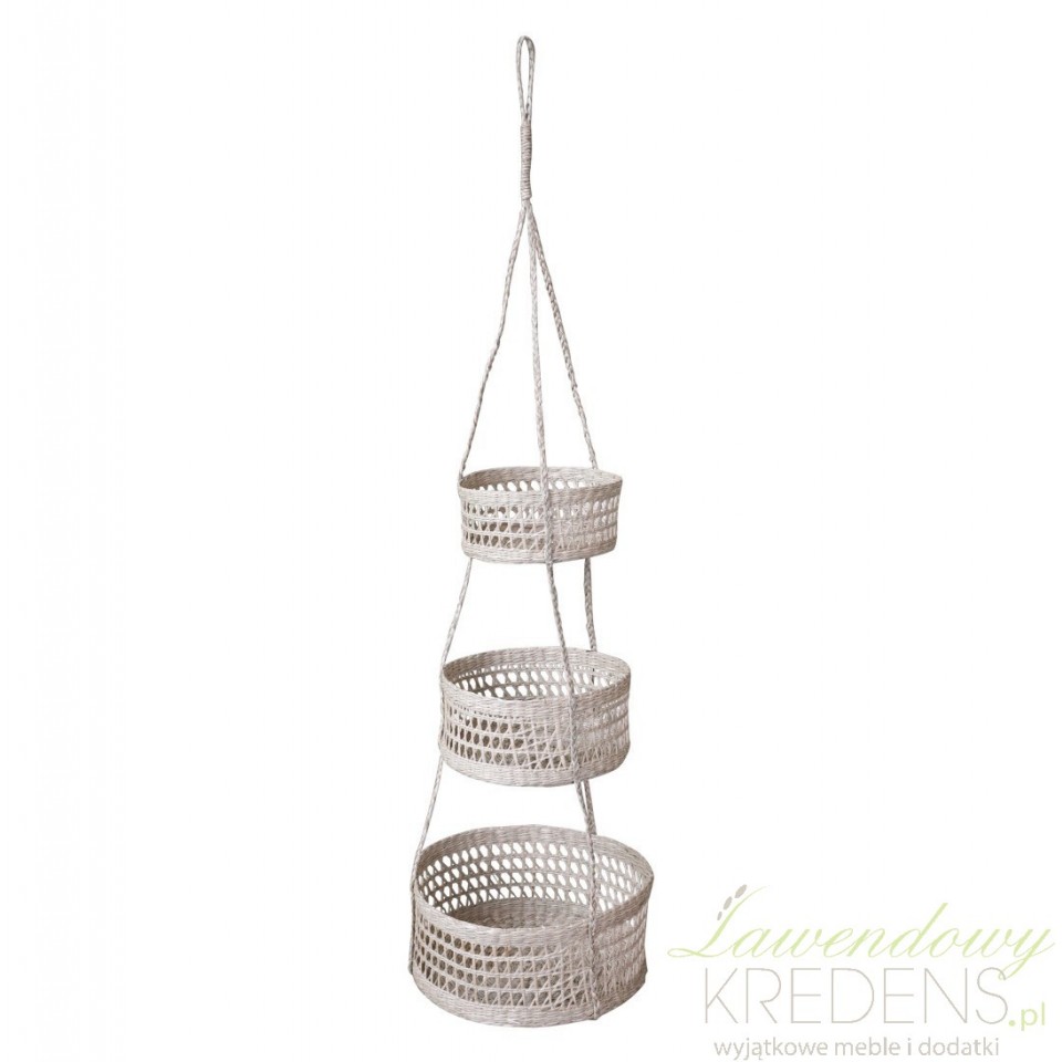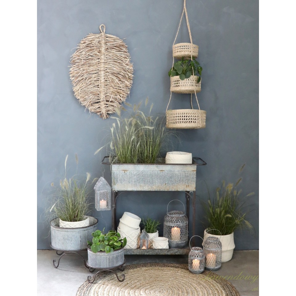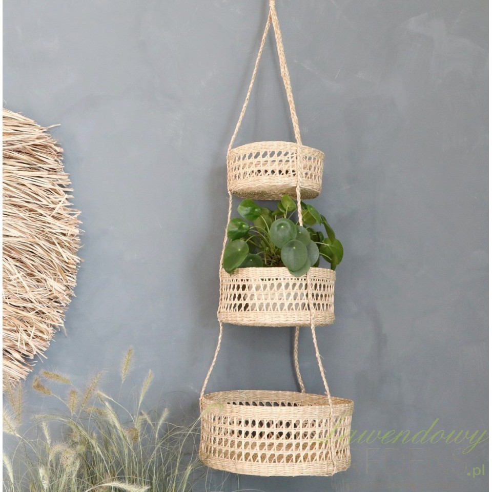 Trzy plecione kosze do zawieszenia zrobione zostały z trawy morskiej. Mają piękną, ażurową strukturę i oferują dużo miejsca na drobiazgi, ale również na większe przedmioty - na przykład na kwiaty w salonie lub kosmetyki w łazience. Przydadzą się jeśli urządzasz wnętrze w stylu balijskim lub skandynawskim. Wiszące kosze od Chic Antique - zamów już dzisiaj!