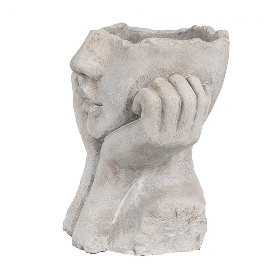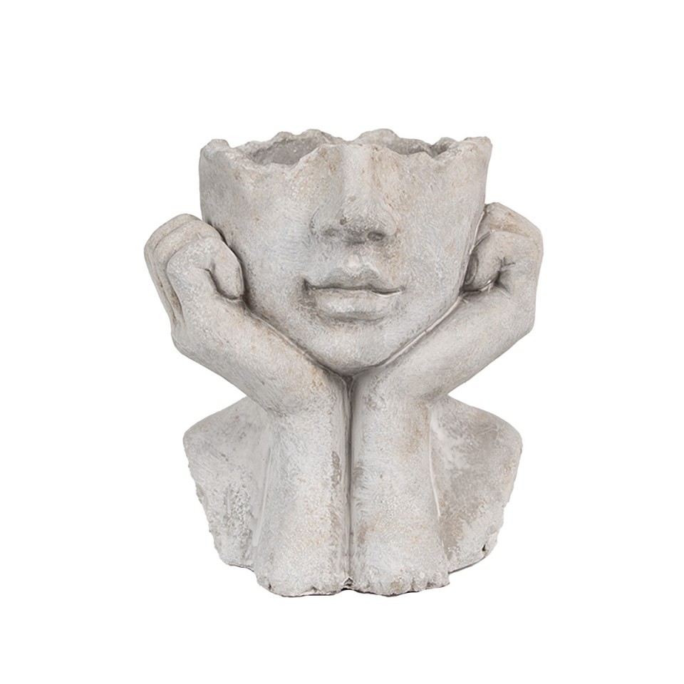 Osłonka na doniczkę w kształcie głowy marki Clayre & Eef to wyjątkowa dekoracja, która łączy artystyczny wyraz z funkcjonalnością. Wykonana z cementu, zachwyca surową fakturą i szlachetnym, szarym odcieniem przypominającym kamień. Rzeźbiarska forma przedstawiająca spokojną twarz opartą na dłoniach wprowadza do wnętrza spokój, refleksję i niepowtarzalny klimat.