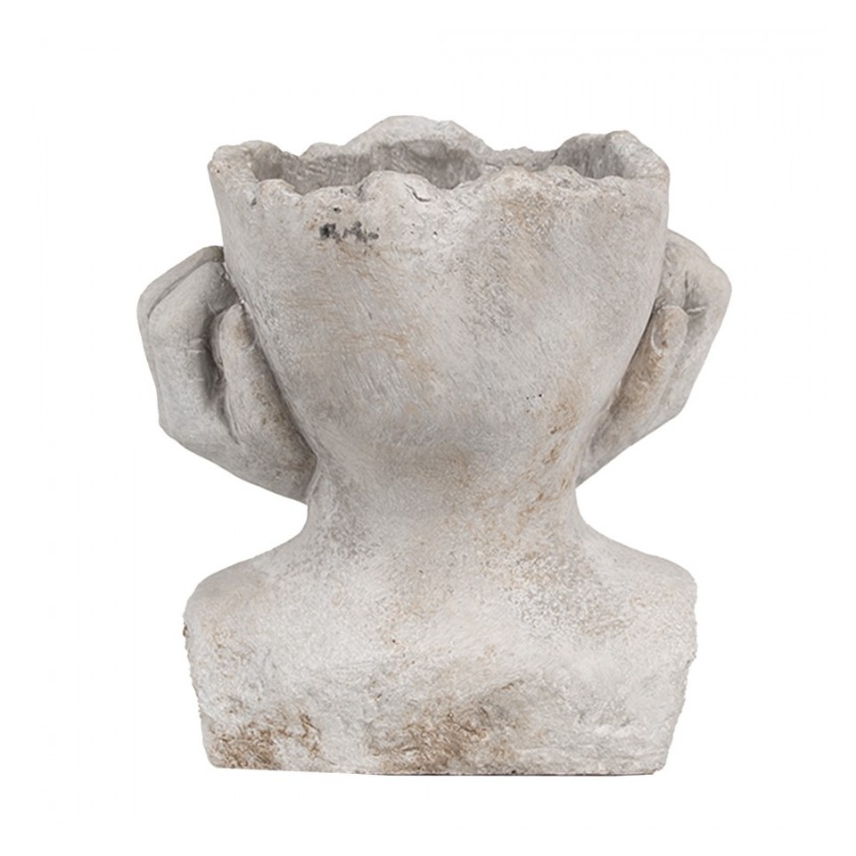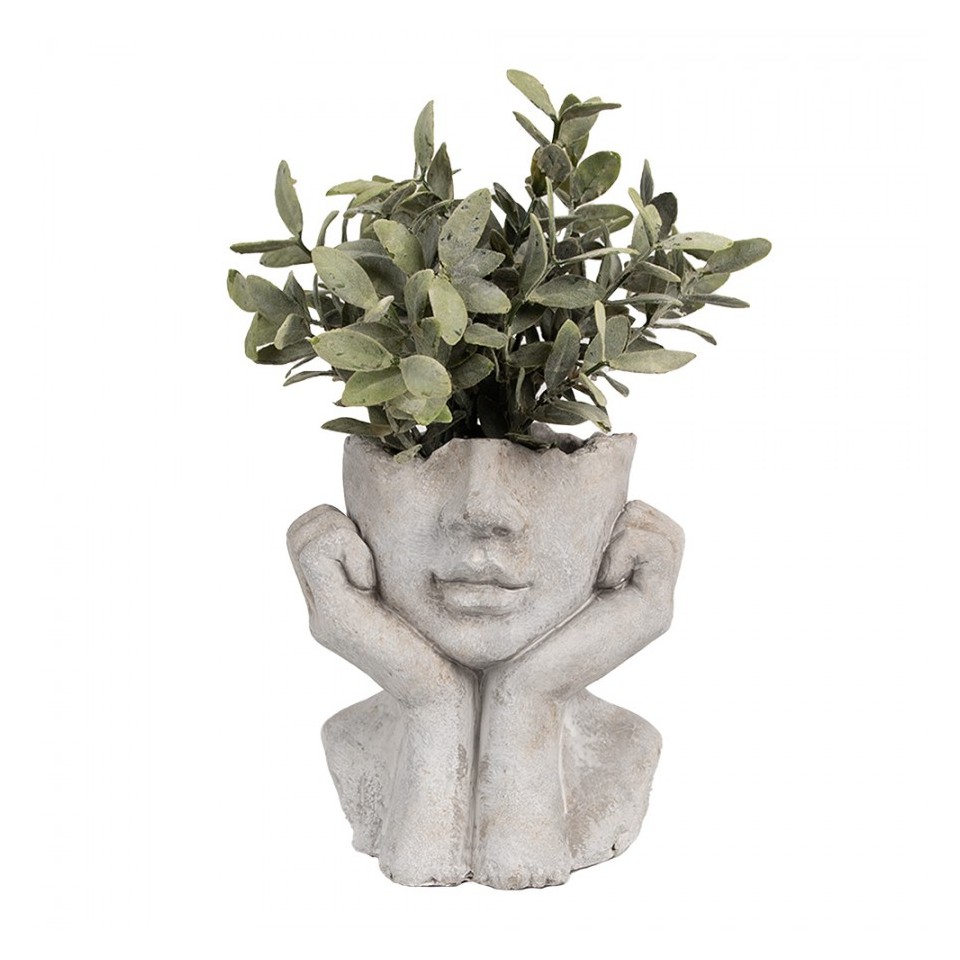 Osłonka na doniczkę w kształcie głowy Clayre & Eef to dekoracja, która łączy sztukę i naturę. Wykonana z cementu, w odcieniu szarości o rzeźbiarskim charakterze, zachwyca oryginalną formą i strukturą przypominającą kamień. Idealna do wnętrz w stylu loft, boho i nowoczesnym.