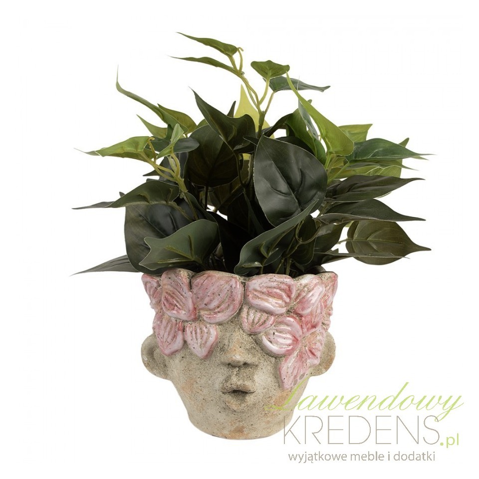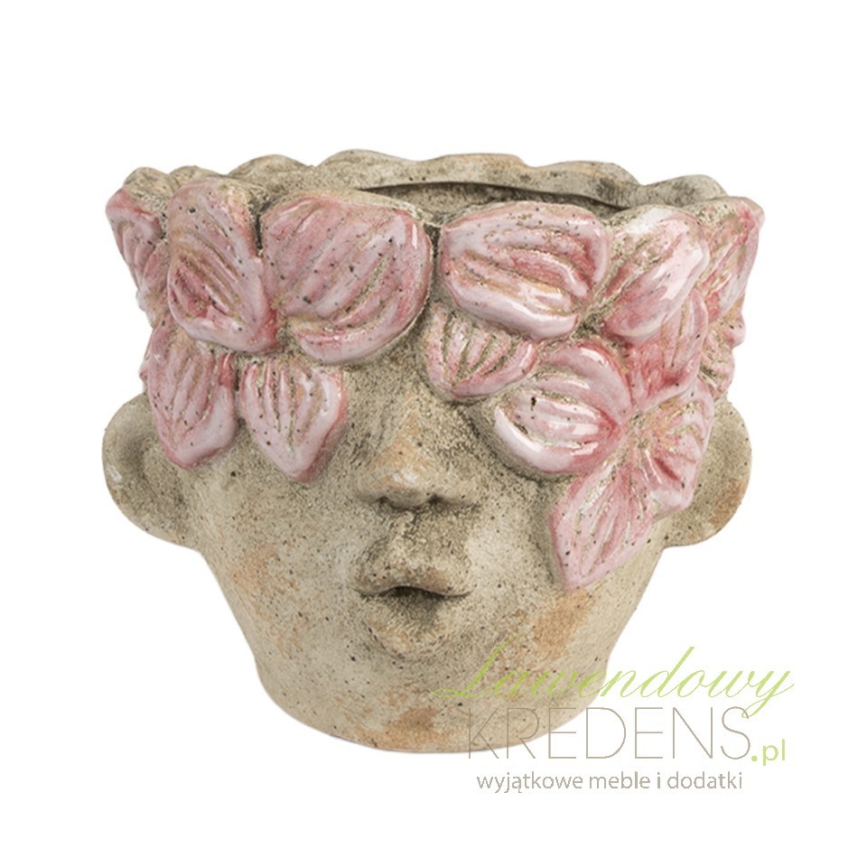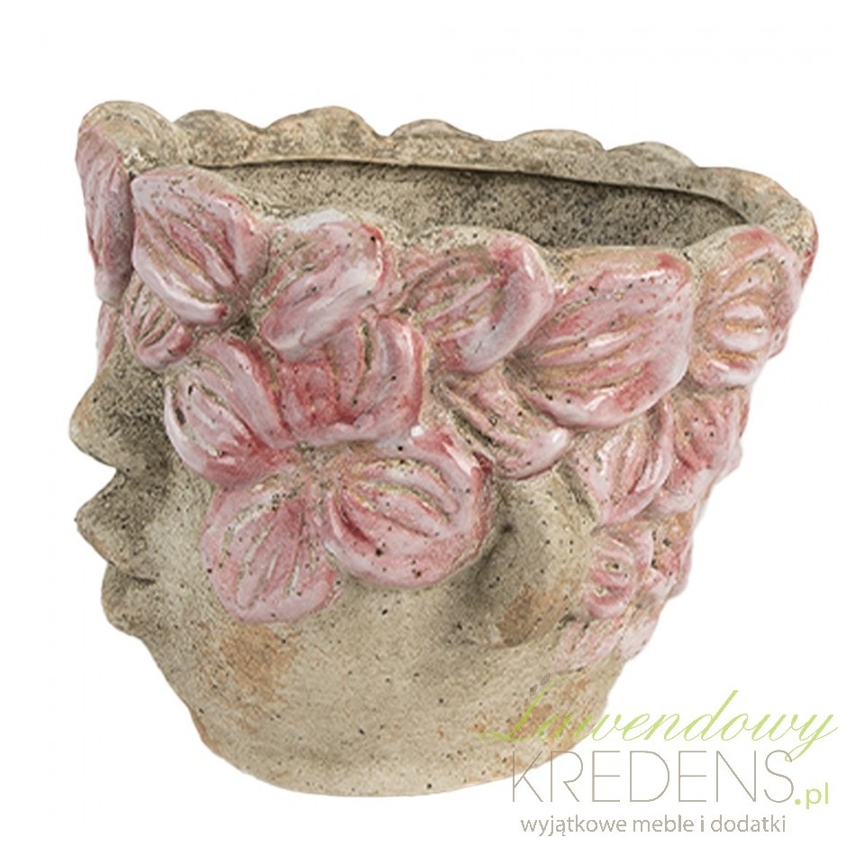 Oryginalna osłonka na doniczkę w kształcie głowy zdobionej różowymi kwiatami to wyjątkowa dekoracja z charakterem. Wykonana z terakoty, przyciąga wzrok naturalnym wykończeniem i artystycznym detalem.