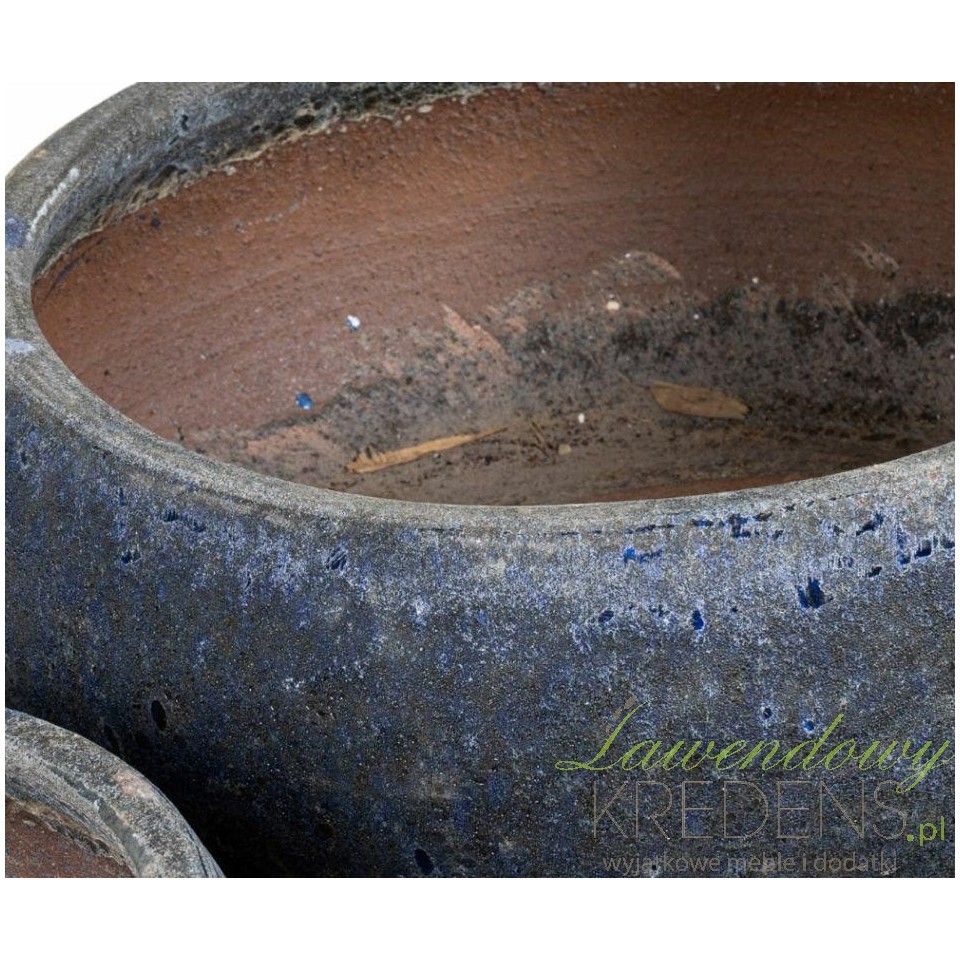 Kolorystyka „old blue” z wyraźną, nieregularną patyną i ziarnistą teksturą daje wrażenie rzemieślniczej ceramiki po latach użytkowania. Polecam zestawiać te donice z trawami (kostrzewa, rozplenica), lawendą, ziołami oraz roślinami o mocnych liściach (hosta, bergenia) – ciemna, przydymiona tonacja wydobywa zieleń i podkreśla naturalny pokrój.