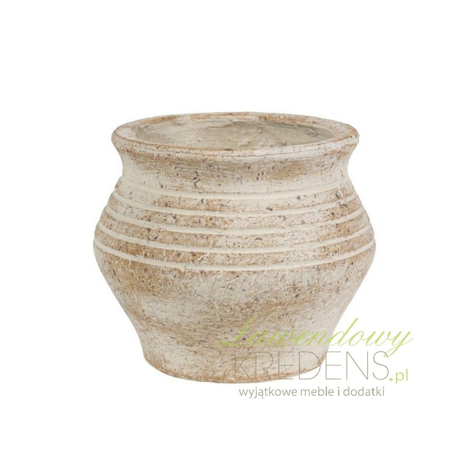 Jako dekorator wnętrz polecam tę osłonkę, gdy chcesz dodać przestrzeni „ziemistości” bez ciężkiego, ciemnego koloru. Ceramika w wydaniu Albero ma charakter postarzany: delikatne smugi, przetarcia i poziome pasy budują wrażenie pracy ręcznej, a nie masowej produkcji. Ten typ wykończenia świetnie wygląda z drewnem, lnem, rattanem i metalem w kolorze starego złota, tworząc spójny klimat rustykalny, cottage lub wabi-sabi.Stabilna osłonka na parapet i stół: 15,5 cm średnicy i 1 kg masy