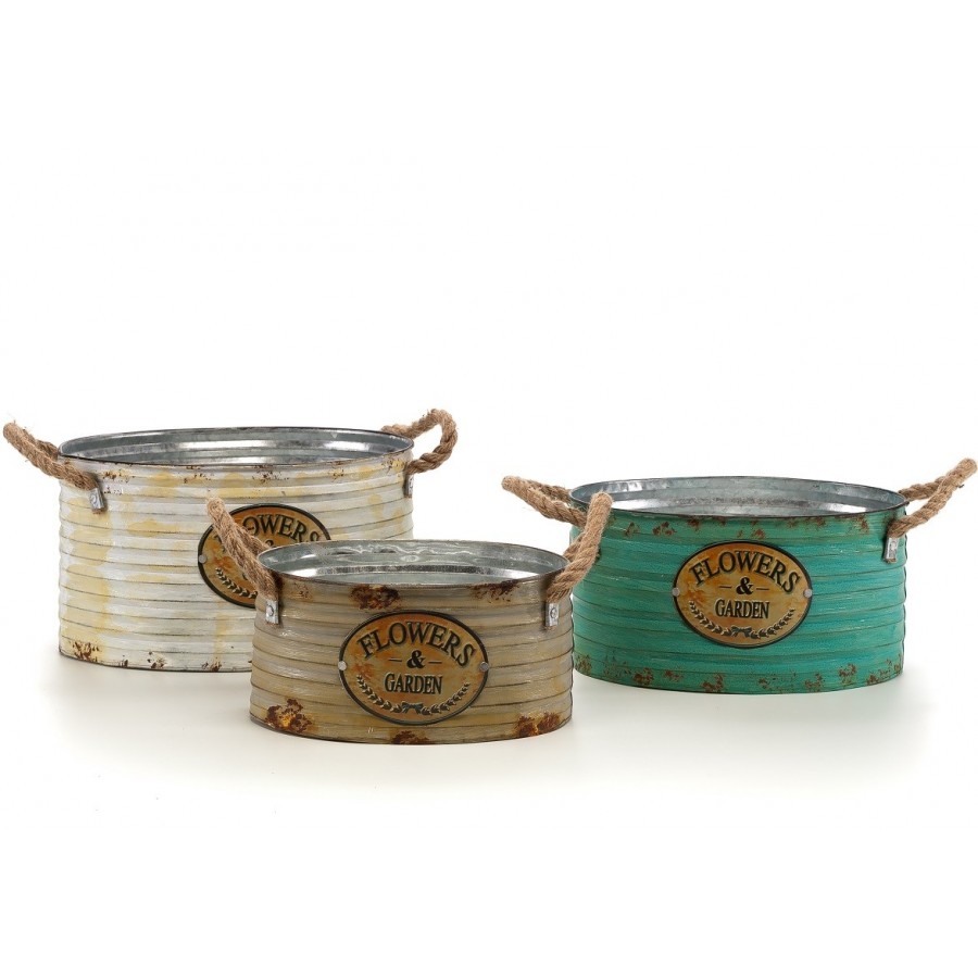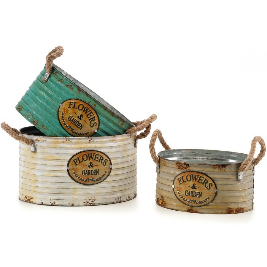 Trzy, urocze osłonki metalowe w różnych odcieniach stanowią niebanalny i oryginalny komplet, dzięki któremu dodasz swojemu mieszkaniu świeżości modernistycznych dekoracji. Puszki wyposażono w zabawne uchwyty w postaci grubo plecionego, jasno-brązowego sznura, dodano również rdzawe postarzenia, co stanowi jedną z cech pięknego stylu z dalekiej Prowansji.