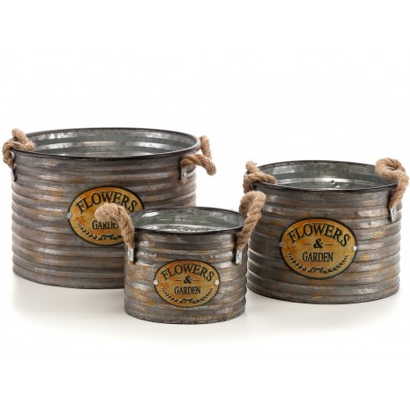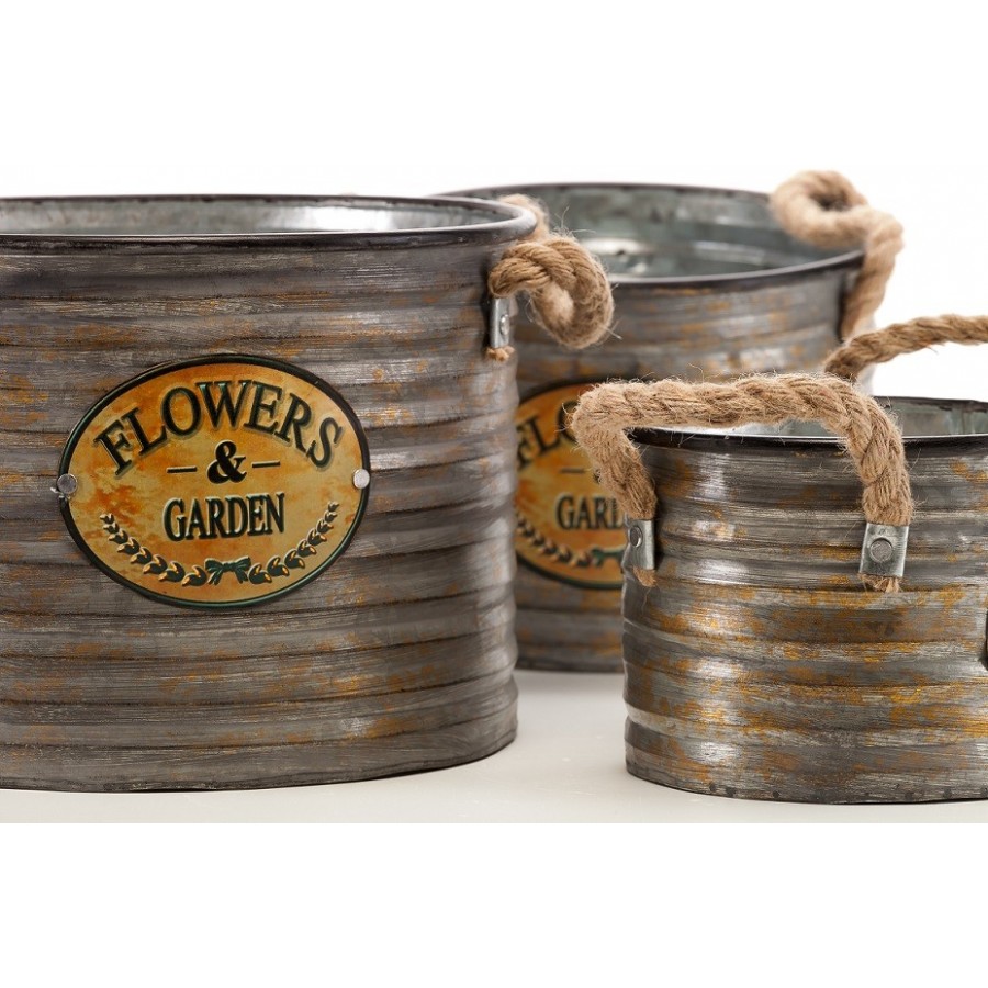 Niesamowity zestaw - trzy osłonki metalowe w trzech rozmiarach w brązowo - beżowym odcieniu zbliżonym do naturalnego. Dekoracyjne osłonki ozdobione zostały tabliczkami z napisem Flowers & Garden i uroczymi parcianymi sznurkami, które tworzą praktyczne i stabilne uchwyty, pomocne m.in. przy przenoszeniu osłonek. Zachwyć wszystkich już dziś!