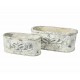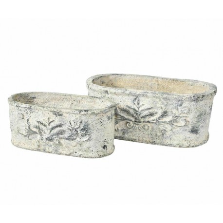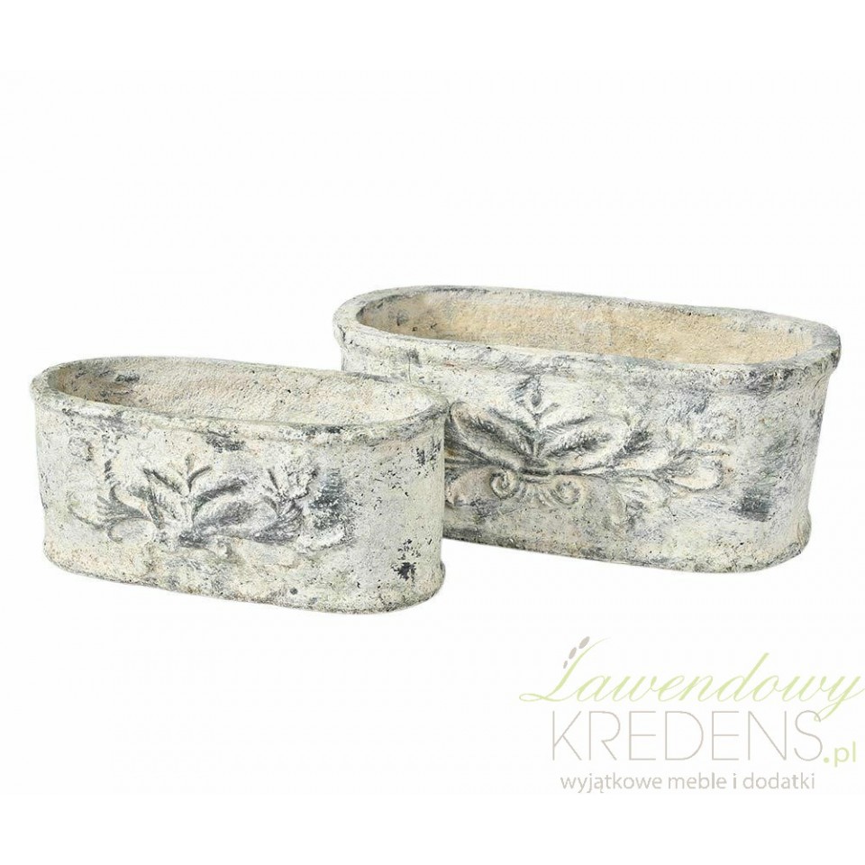 Podłużne, nieszkliwione donice Belldeco w stylu prowansalskim o chropowatej fakturze. Donice mają wypukły, ozdobny dekor.