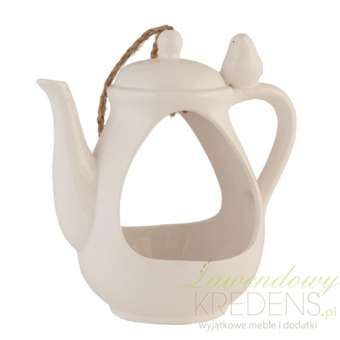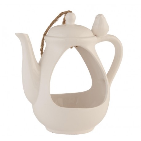 Oryginalny karmnik dla ptaków w kształcie stylowego dzbanka z przykrywką. Zgrabny dodatek wykonano z ceramiki w kolorze kremowym i ozdobiono małym ptaszkiem. Z obu stron karmnik posiada otwarte okienko, a w jego górnej części zamontowano praktyczny sznureczek do zawieszenia. Karmnik ozdobny możesz powiesić na zewnątrz ale też ustawic na parapecie lub na balkonie.