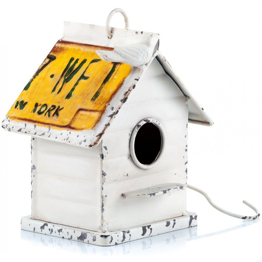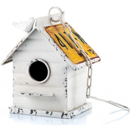 Domek dla ptaków to nie tylko ładna ozdoba, ale także funkcjonalny przedmiot, dzięki któremu budzić Cię będzie piękny świergot mieszkających w domku ptaków. Budkę zbudowano z metalu i pomalowano na dwa odcienie. Kolor biały zdobi ścianki domku, a kolor żółty daszek. Domek wyposażono w ładny, okrągły otwór, przez który ptaki będą mogły do niego wlatywać oraz w łańcuszek zakończony haczykiem, za pomocą, którego można całość zawiesić w dowolnym miejscu. Zastosowano również metodę dekoracyjnych postarzeń. Zachęcamy!