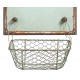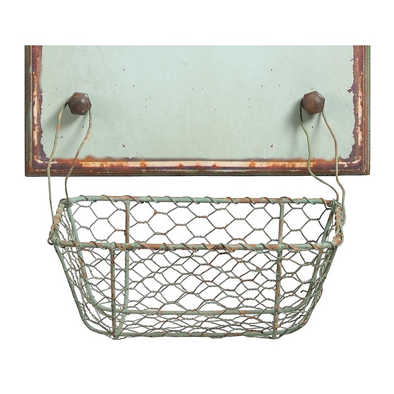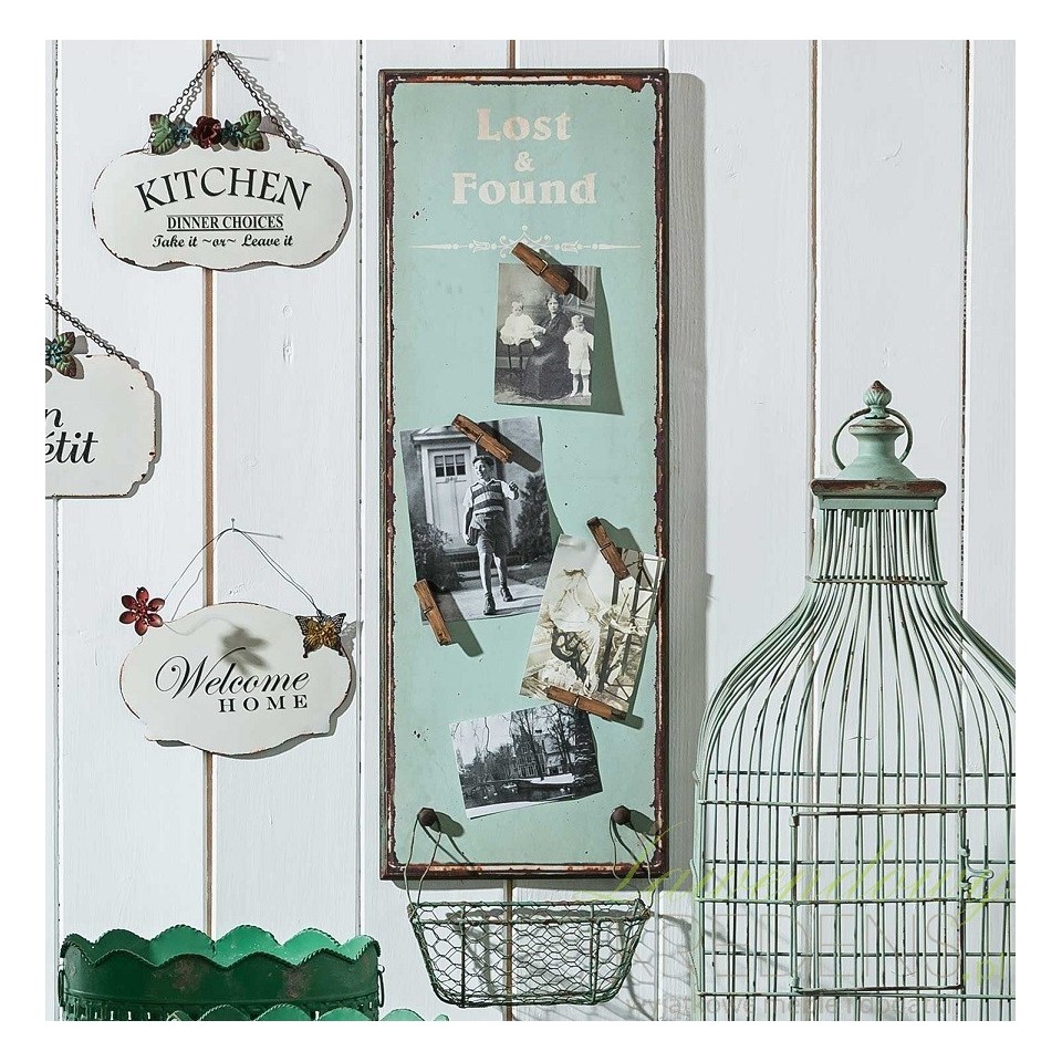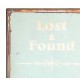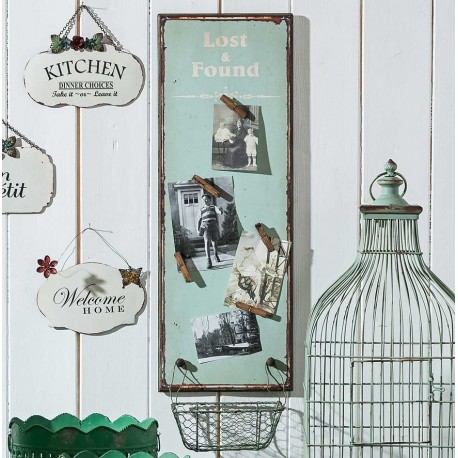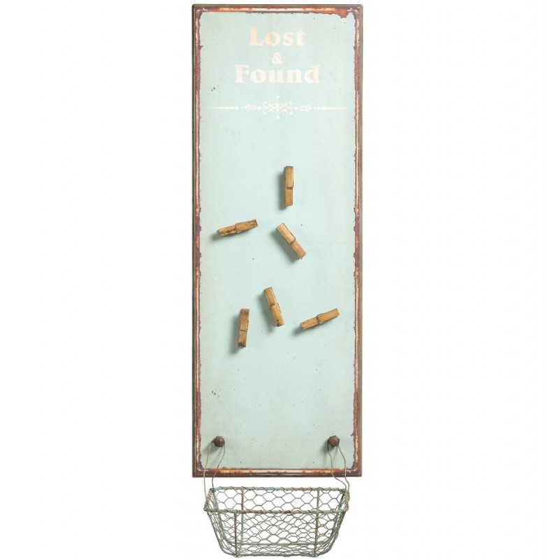 Metalowa tablica magnetyczna retro marki Belldeco z metalowym koszyczkiem oraz z magnesami w kształcie spinaczy do prania. Tablicę dodatkowo zdobi biały napis Lost & Fond oraz imitacja rdzy i odprysków farby przy krawędziach tablicy.