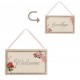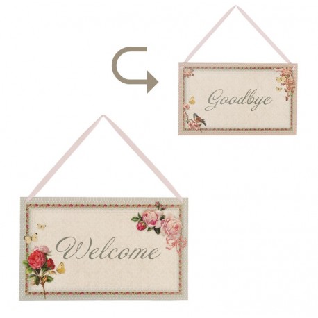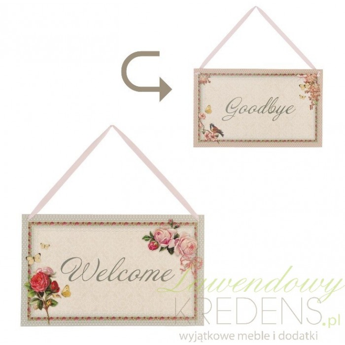 Zawieszka do drzwi ma prostokątny kształt i przypomina kopertę. Tabliczka na drzwi ozdobiona jest pięknymi różyczkami i można ją obracać w dwie strony. Z jednej strony znajduje się napis Welcome, witający gości, a z drugiej napis Goodbye, który ich żegna. Zawieszka dwustronna to wspaniała i urocza dekoracja drzwi czy szyby.