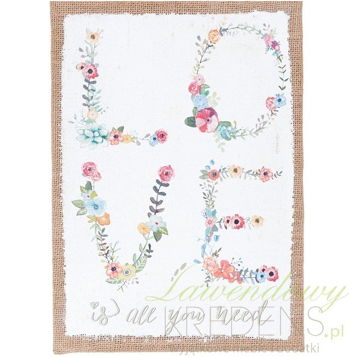 Prostokątny obrazek prowansalski ma białe tło a na nim napis LOVE wykonany z kolorowych kwiatków. Dodatki prowansalskie mogą udekorować każde miejsce w domu. Obrazy w stylu prowansalskim z naszego sklepu wykonane są z juty, metalu czy też drewna.