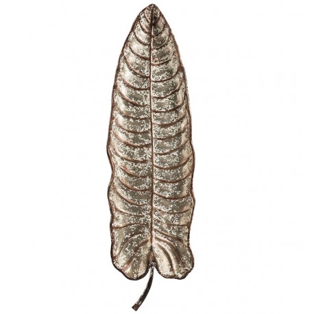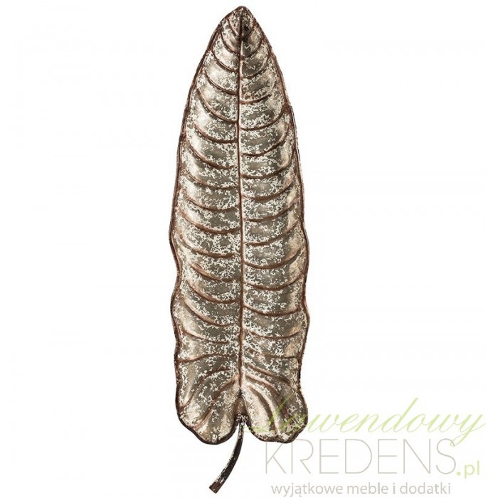 Dekor ścienny w kształcie liścia wykonano z metalu. Atrakcyjny wygląd zapewnia mu ciekawa kolorystyka z akcentem złota i srebra oraz podłużny, lekko wyprofilowany kształt. Nie wahaj się wykorzystać tej atrakcyjnej ozdoby na swojej ścianie w szczególności jeśli jesteś miłośnikiem stylu vintage. Takie ozdoby nie tylko ciekawie wyglądają ale wprowadzają do wnętrz niesamowitą aurę!