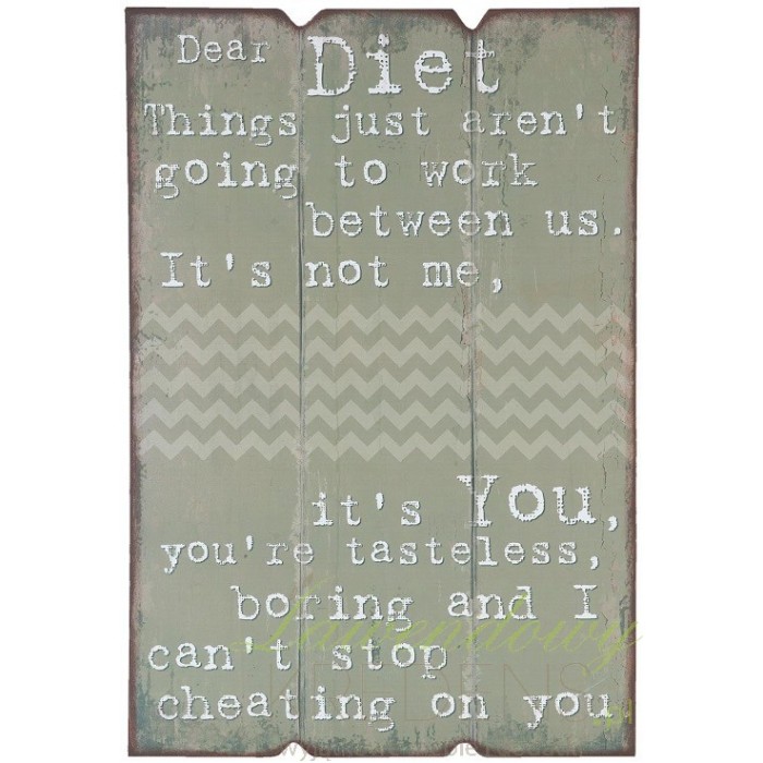 Obraz retro dieta pokryty jest grafiką w kolorze zielonoszarym, dzięki czemu wykonane na nim jasne napisy są doskonale widoczne nawet z daleka. Nierówne, dolne i górne krawędzie z zaznaczonymi rowkami sprawiają, że obraz z napisami prezentuje się jak stara dekoracja ścienna. Zabawny napis na obrazku, mimo że mówi o diecie z pewnością przypadnie do gustu niejednego łasucha. Obrazy w stylu retro od Clayre&Eef specjalnie dla Twojego wnętrza!