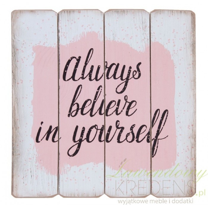 Obraz z napisami to połączone ze sobą pionowo cztery deski układające się w kształt kwadratu. Obraz retro jest muśnięty białą farbą, a pośrodku ma kleks w różowym kolorze. Na różowym tle naniesiono czarne napisy ozdobne układające się w napis "Believe in yourself". Obrazy retro są doskonałe również do aranżacji pokoju nastolatka.