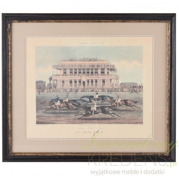 Prostokątny obraz z ścigającymi sie końmi i jeźdzcami został umieszczony w ciemnej ramie, z którą tworzy prawdziwe dzieło sztuki na miarę francuskiego stylu.