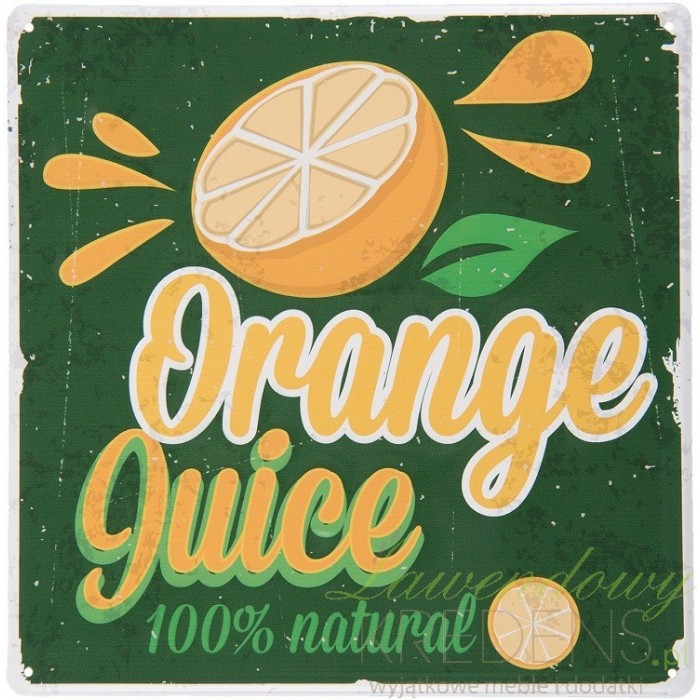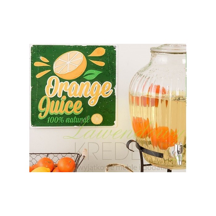 Zielona tabliczka metalowa mająca żółte napisy i grafikę połówki cytryny. Obrazki vintage świetnie sprawdzają się w różnego typu restauracjach. Obrazki metalowe to świetna alternatywa dla cieżkich i dużych obrazów.
