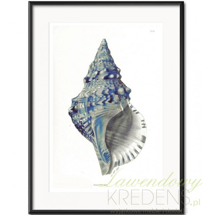 Obraz w stylu marynistycznym z białym tłem a na nim piękna wzorzysta muszla w kolorze niebieskim!