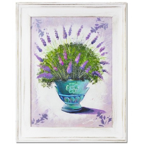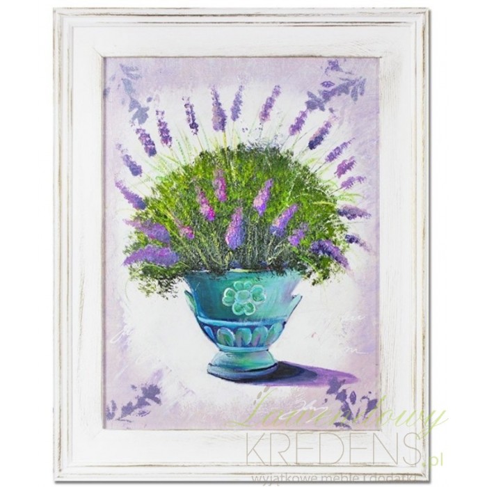 Obraz z lawendą w białej ramie wykonanej z drewna. Przetarcia wykonane na wyszlifowanych krawędziach sprawiają, że ręcznie malowane dzieło prezentuje się zaskakująco korzystnie. Obraz Prowansja przedstawiający puchar z kwitnąca lawendą na fioletowym tle to esencja stylu prowanslaskiego. Wybierz piękne obrazy z lawendą i wprowadź radość do swojej kuchni bądź salonu.
