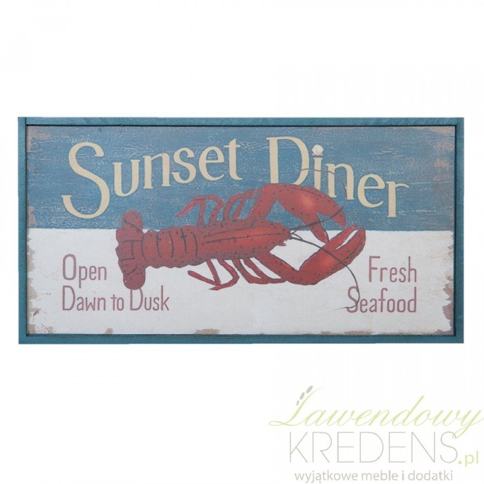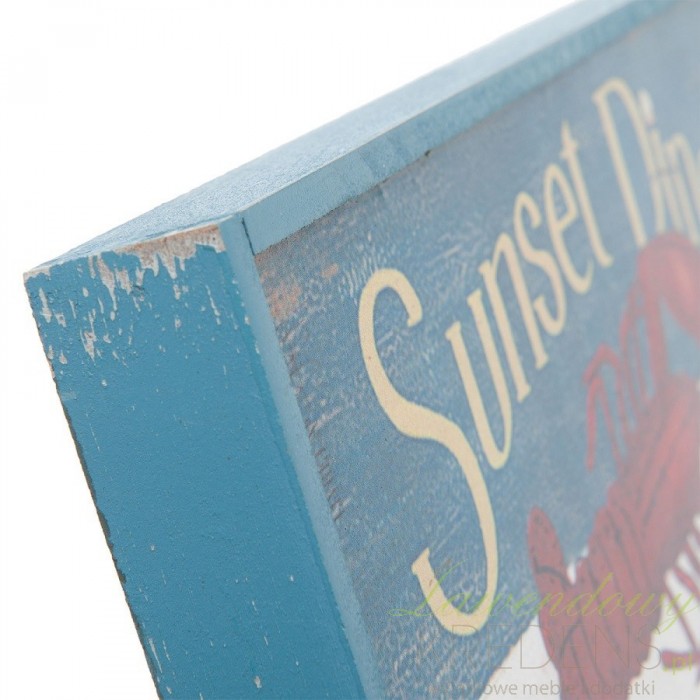 Restauracje mające w ofercie owoce morza i nadmorskie knajpy serwujące świeże ryby wiedzą, że nie tylko dobre jedzenie ale także styl lokalu jest w stanie przyciągnąć tłumy gości. Dodatki w stylu marynistycznym od marki Clayre&Eef spełnią Twoje oczekiwania. Obrazek marynistyczny możesz zaawiesić na ścianie lub na drzwiach. Obrazek z homarem to prostokątny obraz z drewna, postarzony i zdobiony napisami Sunset Dinner na dwukolorowym tle.