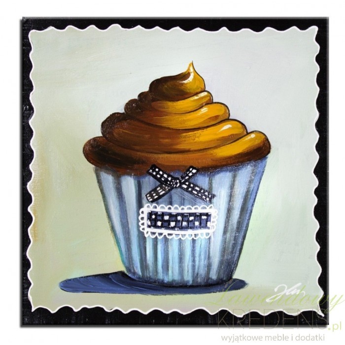 Kwadratowy obrazek do kuchni ozdobiony czarną ramką z lekkimi falami. Jest to obrazek z babeczką umieszczoną na jasnym tle. Obrazki do kuchni z naszej oferty, to niezwykle kolorowe i smaczne przedmioty dla każdego.