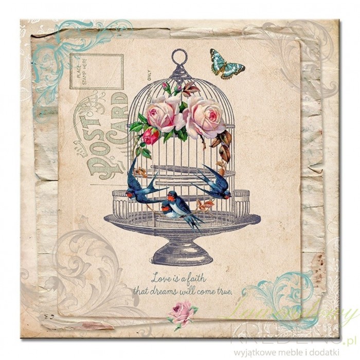 Obraz prowansalski o kwadratowym kształcie posiadajacy jasne tło i grafikę klatki dla ptaszków, a wniej widoczne są piękne róże. Dookoła niej zaś fruwają motyl i kilka kolorowych ptaków. Genialnym pomysłem są obrazy w stylu prowansalskim, zawisające na każdych ścianach.