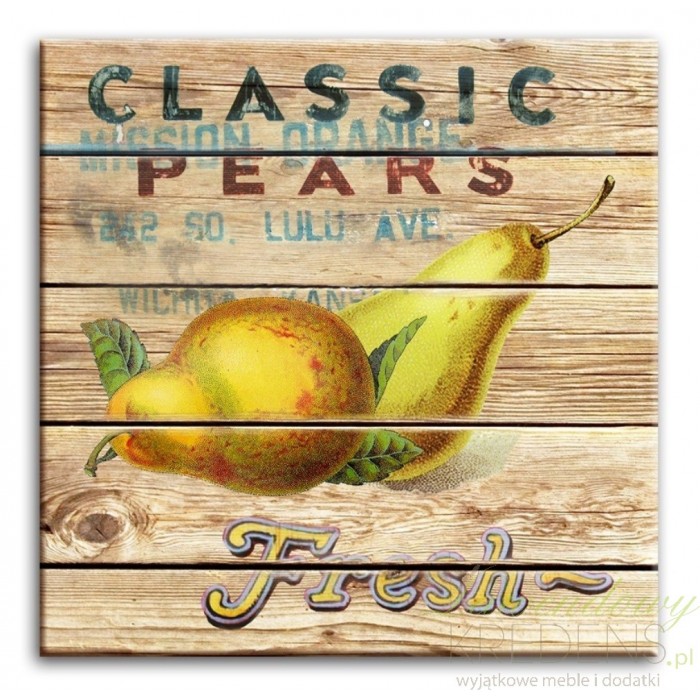 Kwadratowy obraz z owocami to niezwykle smaczna dekoracja na przykład do kuchni. Obraz retro z brązowym tłem imitującym drewniane deski, a na nich są leżące zółte, soczyste gruszki. Obrazy z owocami to zawsze modny dodatek do różnych pomieszczeń.