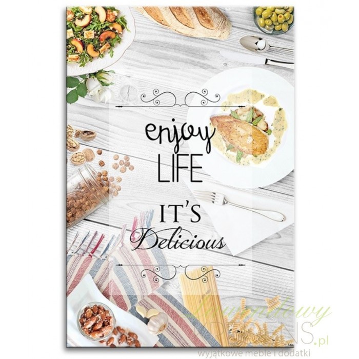 Prostokątny obraz do kuchni lub restauracji pomoże stworzyć przyjazną atmosferę dopasowaną do danego wnętrza. Obraz przedstawia angielskie napisy wykonane na tle przedstawiającym suto zastawiony stół. Dzięki takim dodatkom jak obraz do restauracji inspirowanymi kuchnią śródziemnomorską zyskasz niepowtarzalne aranżacje. Wybierz kolorowe obrazy do kuchni już teraz i zachwyć domowników gustownym dodatkiem.