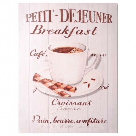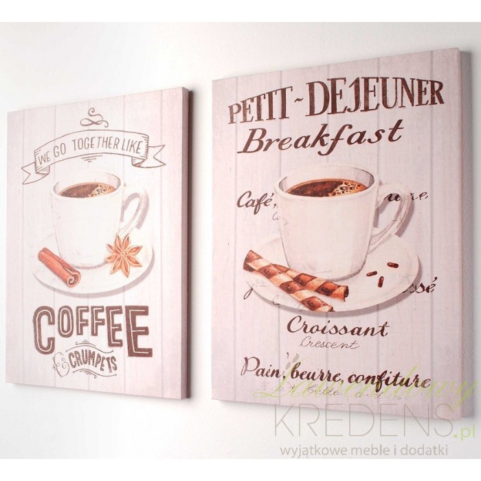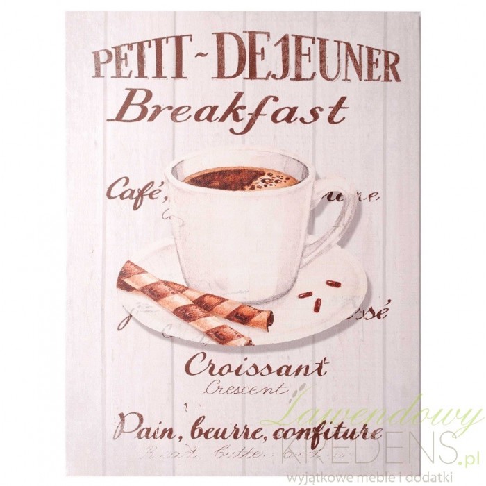 Prostokątny obraz z kawą przedstawia filiżankę wypełnioną świeżo zaparzoną kawą i dwie chrupiące rurki. Nad oraz pod filiżanką znajdują się także ozdobne napisy 'Petit dejeuner breakfast'. Dekoracje ścienne takie jak obraz w stylu francuskim to doskonały pomysł na przytulniejszą niż dotąd kuchnię lub wystrój kawiarni. Obrazy z kawą robią wrażenie i od razu masz ochotę napić się świeżo zmielonej kawy!