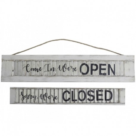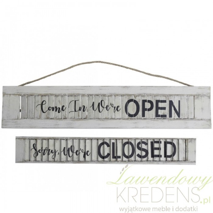 Tablica prowansalska jest prostokątna i wykonana z drewna sosnowego. Dzięki pomysłowości marki Chic Antique ta tablica wygląda jak podłużna żaluzja. Została pomalowana na szaro i postarzona. Po obu stronach naniesiono na nią czarne napisy OPEN i CLOSED. Doskonała do zawieszenia na drzwiach wejściowych do Twojego lokalu.