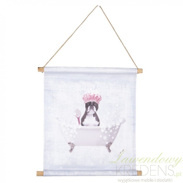 Kwadratowy obrazek wykonany z materiału i dwóch deseczek drewnianych będzie cudownie wyglądał zarówno na białej jak i na każdej innej ścianie. Na obrazku znajduje się pies w koronie, który bierze kąpiel w dużej wannie. Zawiesisz go na ścianie za pomocą parcianego sznurka. Potrzebujesz także innych dodatków do łazienki? Wszystko znajdziesz w naszym sklepie!