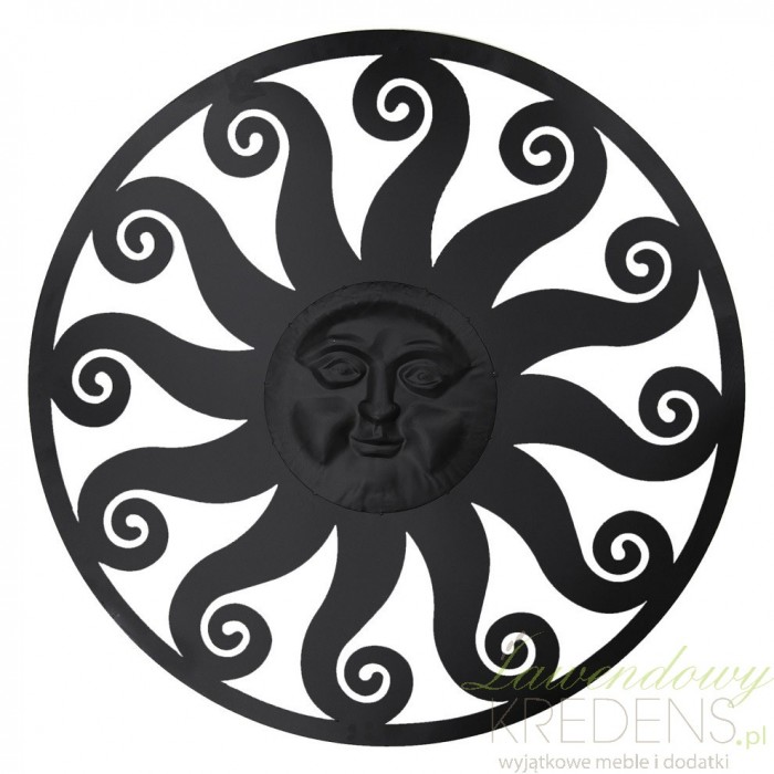 Dekoracja ścienna metalowe słońce to metalowy pierścień, pośrodku którego zamocowano płaską rzeźbę metalową w kształcie słońca z finezyjnie wygiętymi promieniami i uśmiechniętą buźką.