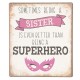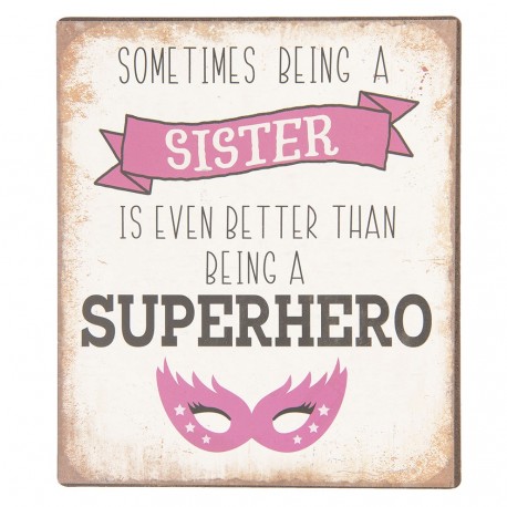 Metalowa tabliczka na ścianę to doskonały sposób na przekazanie kilku ciepłych słów swojej siostrze lub bratu poprzez zabawną sentencję. Metalowa tabliczka jest prostokątna i posiada ozdobny napis " Sometimes being a sister is even better than being a superhero". Jasny kolor tła i kolorowy napis to niezwykle ciekawe i czytelne połączenie. Postarzone krawędzie sprawiają, ze tabliczka wygląda na starą.