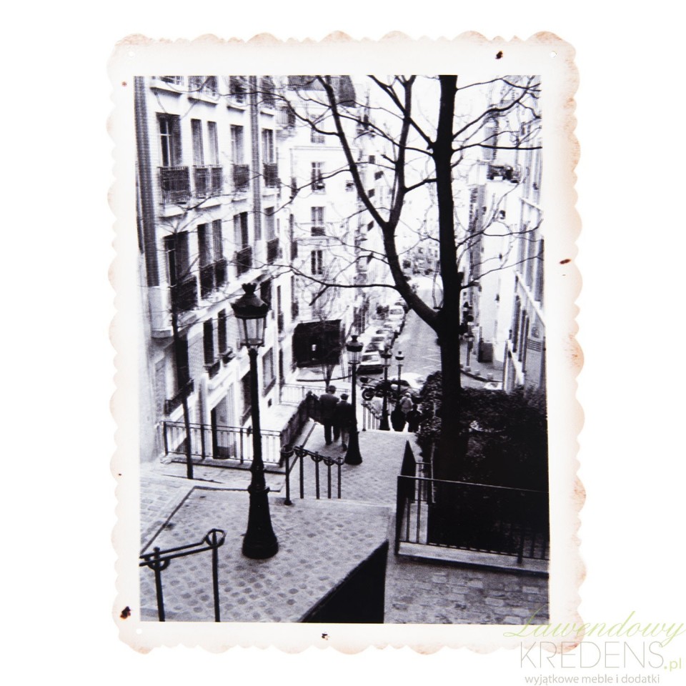 Prostokątny obrazek metalowy wykonany został w stylu retro i przypomina starą, czarno-białą pocztówkę, na co wskazują celowe postarzenia widoczne na krawędziach dekoracji.