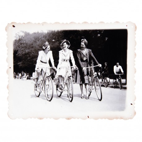 Prostokątny obrazek z gęsto falowaną krawędzią to jeden z gadżetów, który możesz wykorzystać w wielu aranżacjach. Obrazek retro jest czarno-biały i przedstawia elegancko ubrane kobiety jadące na rowerach. Ich rozbawione twarze przyczynią się do stworzenia radosnej atmosfery w każdym pomieszczeniu. Postarzane obrazi retro przypominają dawne fotografie.
