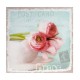 Obrazek firmy Belldeco w śliczne pąki bladoróżowych róż w klasycznej białej filiżance, na błękinym tle z delikatymi napisami.