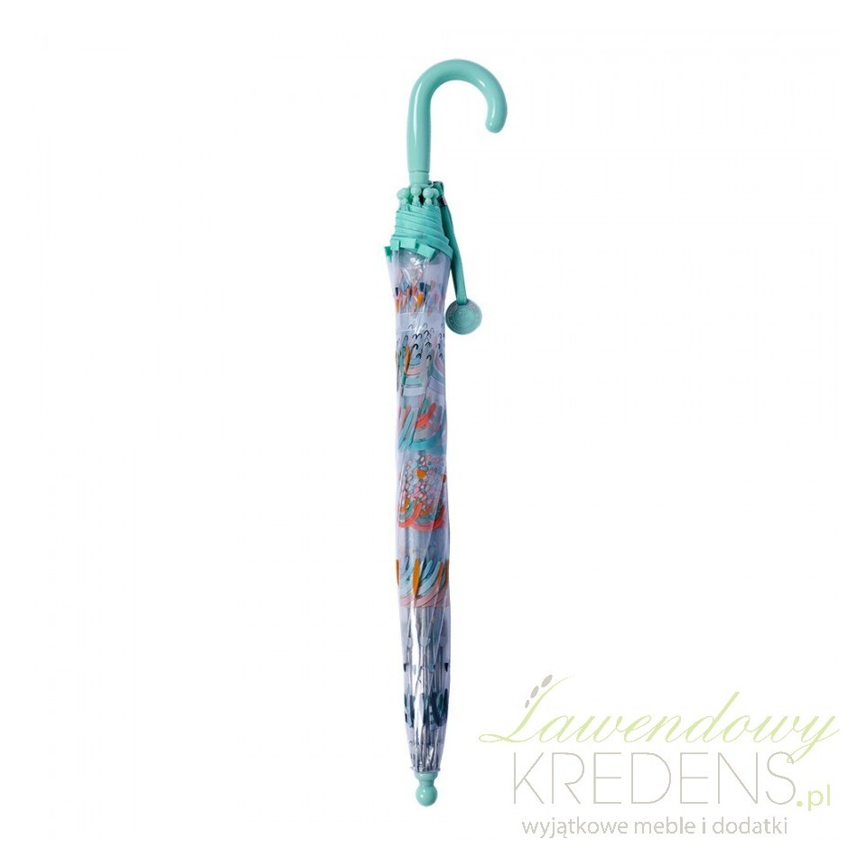Wygodna, turkusowa rączka została zaprojektowana z myślą o małych rączkach, zapewniając pewny chwyt i łatwe prowadzenie. Dzieci będą zachwycone, gdy będą mogły bawić się tym wesołym parasolem, rozwijając swoją wyobraźnię i tworząc magiczne opowieści o deszczowych przygodach.