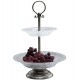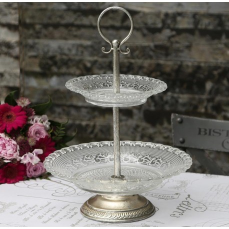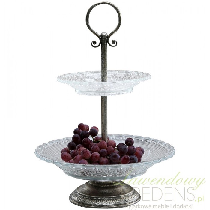 Dwupiętrowa etażerka metalowa z wykonanymi z grubego szkła talerzami i wygodnym uchwytem z dużym uchem. Dekoracyjne dodatki do kuchni takie jak etażerka metalowa sprawią, że Twój stół wyglądął będzie elegancko, a wszystko będzie miało swoje miejsce. O takiej zawsze marzyłaś!