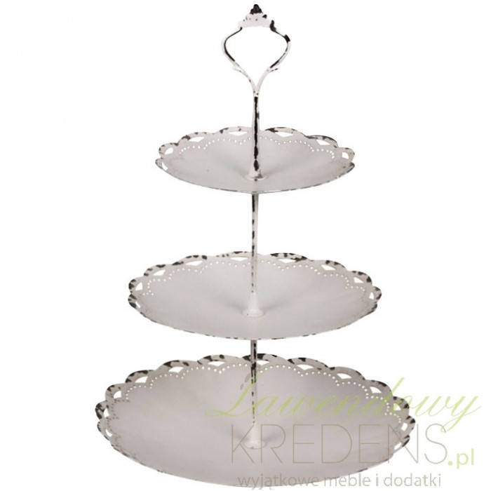 Trójpoziomowa etazerka w stylu prowansalskim to niezapomniany dodatek stołu, o którym zawsze będziesz pamiętać. Dzięki trzema tacom istnieje możliwość zaoszczędzenia miejsca i rozdysponowaniu ich na różne produkty takie jak owoce, ciasta czy ciastka. Kremowy kolor świetnie przełamuje konwencjonalne barwy w każdym wnętrzu!