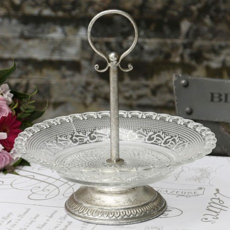 Etażerka prowansalska firmy Chic Antique wykonana jest z wysokiej klasy metalu i szkła. Stoi na okrągłej metalowej nóżce i posiada wysoki i wygodny uchwyt do przenoszenia. Etażerka jest bardzo dekoracyjna i posiada wspaniały biały wzór.