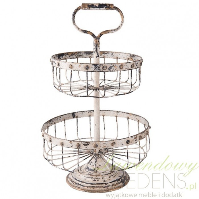 Widoczne ślady rdzy i ciemne przetarcia sprawiają, że etażerka prowansalska wygląda na bardzo starą i nieużytkowaną przez długie lata. Dwa ażurowe koszyczki to świetny sposób by podać na stół owoce lub inne smakołyki, które najpierw ucieszą twoje oczy a później podniebienie. Etażerka metalowa ustawiona jest na okrągłej podstawie i ma na górze prosty uchwyt służący do bezpiecznego przenoszenia. Dodatki do kuchni od Clayre&Eef to prawdziwe skarby!