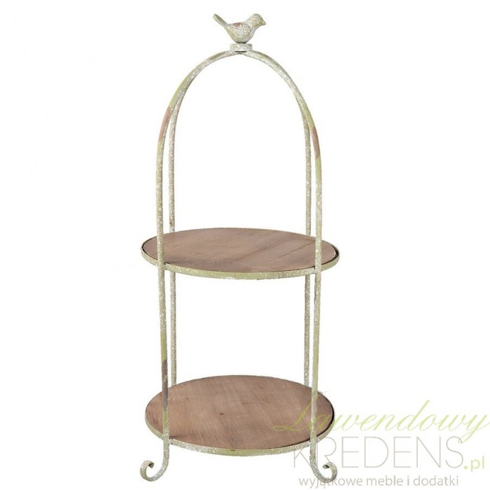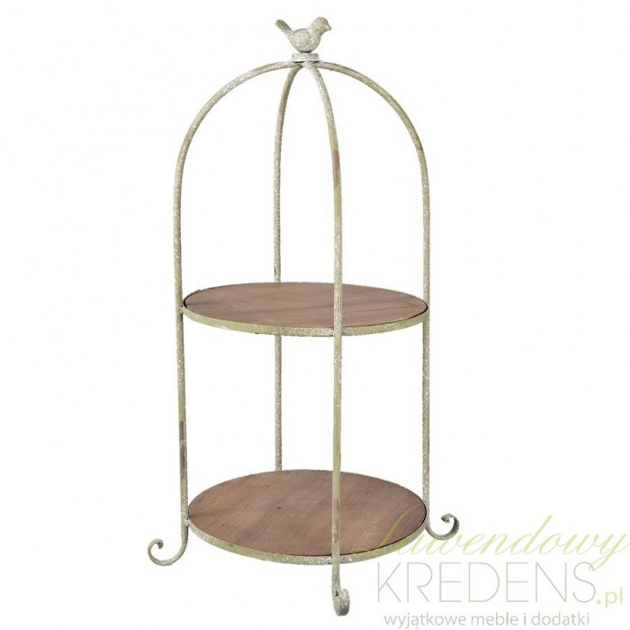 Celowo postarzana etażerka w stylu prowansalskim została wykonana z połączenia metalowych oraz drewnianych elementów i wykończona na szczycie dekoarcyjnym ptaszkiem.