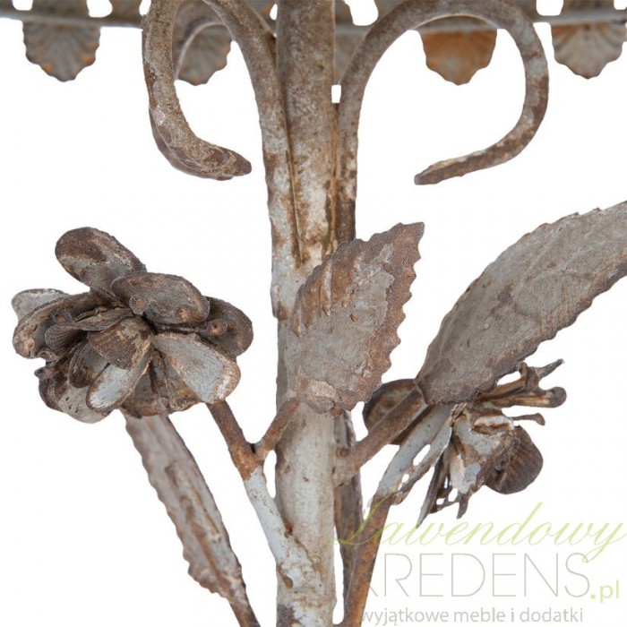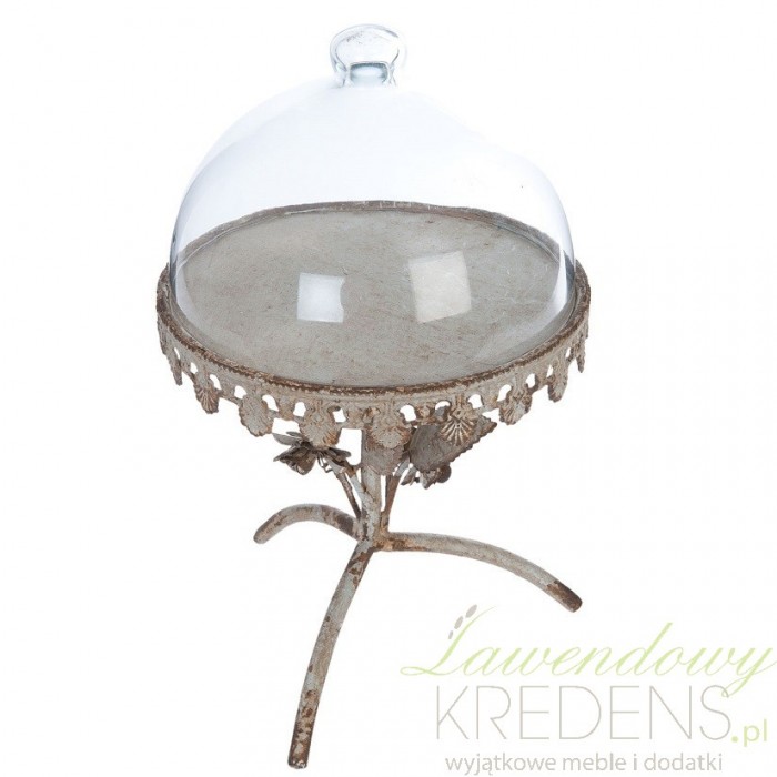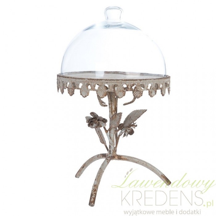 Patera prowansalska z kloszem to wyjątkowy egzemplarz, ponieważ zdobią ją metalowe uformowania na wzór roślin i postarzenia.