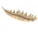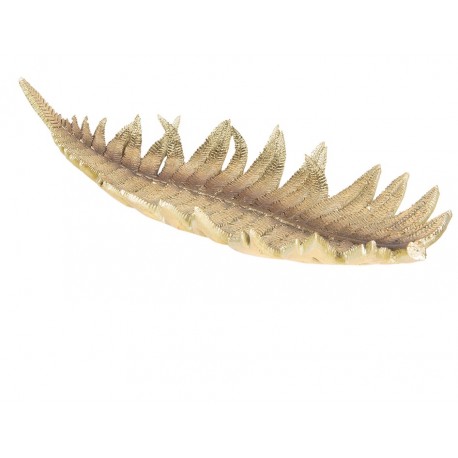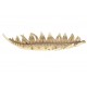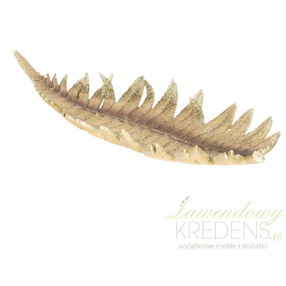 Niska patera ozdobna w kolorze starego złota wygląda jak metalowa forma liścia. Doskonałe połączenie z białym i brązowym stołem.