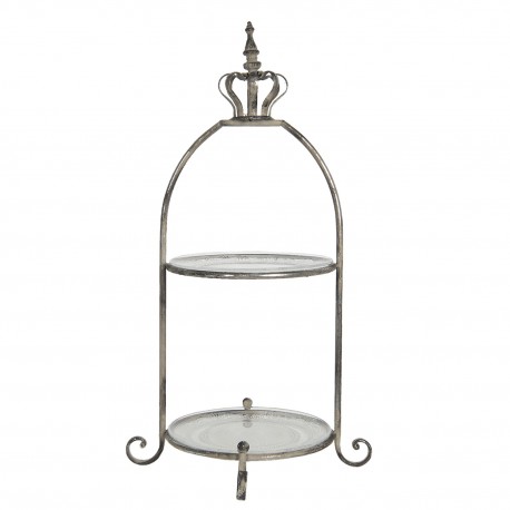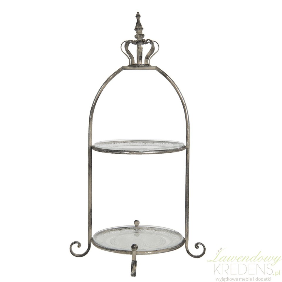 Ta wysoka patera ze szklanymi talerzami wygląda jakby pochodziła z zastawy stołowej z królewskiej jadalni. Poświadcza to iście królewski atrybut czyli metalowa korona na jej szczycie. Dwupiętrowa patera ma metalowy stelaż i dwa okrągłe talerze wykonane z przeźroczystego szkła. Patery ze szklanymi talerzami od Clayre&Eef zdobi coś jeszcze - zawinięte, krótkie i dekoracyjne nóżki.