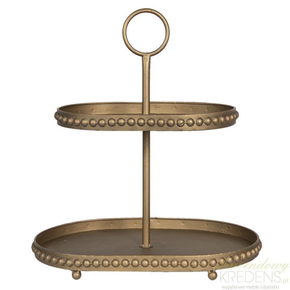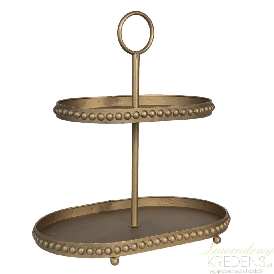 Piętrowa patera została wykonana z metalu w kolorze starego złota. Owalne talerze mają zdobione ranty, a nad nimi zamocowano poręczny uchwyt ułatwiający przenoszenie. Piętrowe patery to świetny spsoób aby zmieścić znacznie więcej smakołyków niż jest w stanie pomieścić zwykły talerzyk. Metalowa patera to projekt marki Clayre & Eef.