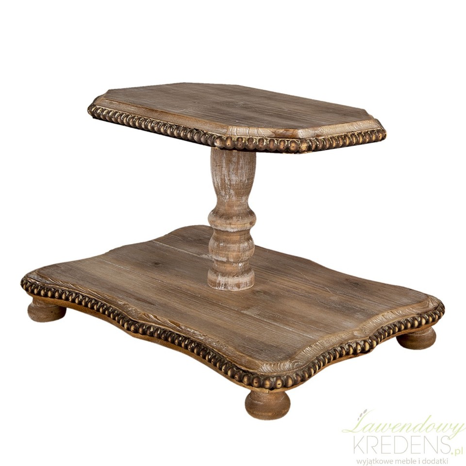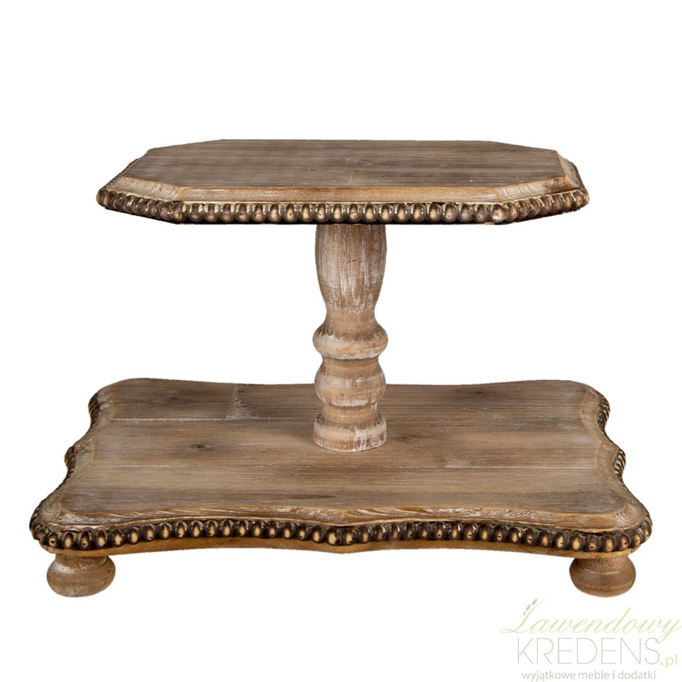 Wykonane z drewna dodatki do jadalni dodają stołowym aranżacjom antycznego charakteru. Podwójna, piętrowa patera drewniana na czterech płaskich nóżkach ma postarzane wykończenie, widoczne sęki i słoje, dzięki czemu stanowi cudowny akcent dekoracyjny na przyjęciach w stylu boho, retro oraz vintage. Dzięki solidnemu wykonaniu, piętrowe patery na ciasto gwarantują długotrwałą funkcjonalność i nieskazitelny stan. Podkreśl styl prowansalski swojego wnętrza wybierając dodatki i meble Clayre & Eef nie tylko na specjalne okazje!
