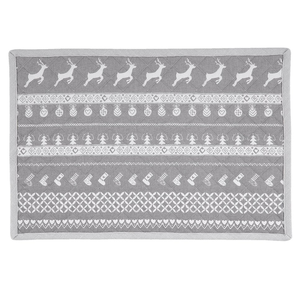 Prostokątne podkładki stołowe zdobią poziome linie z choinkami, reniferami i bombkami. Szaro białe, bawełniane podkładki są niezwykle trwałe dzięki przeszyciom na całej długości. Z powodzeniem usatysfakcjonują sześcioosobową rodzinę. Rozłóż podkładki na stół i miej pewność, że stylowo wygląda.