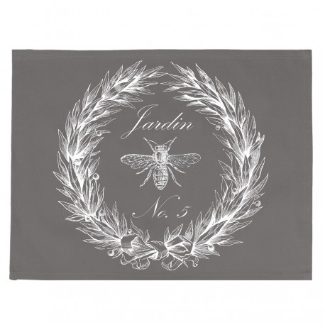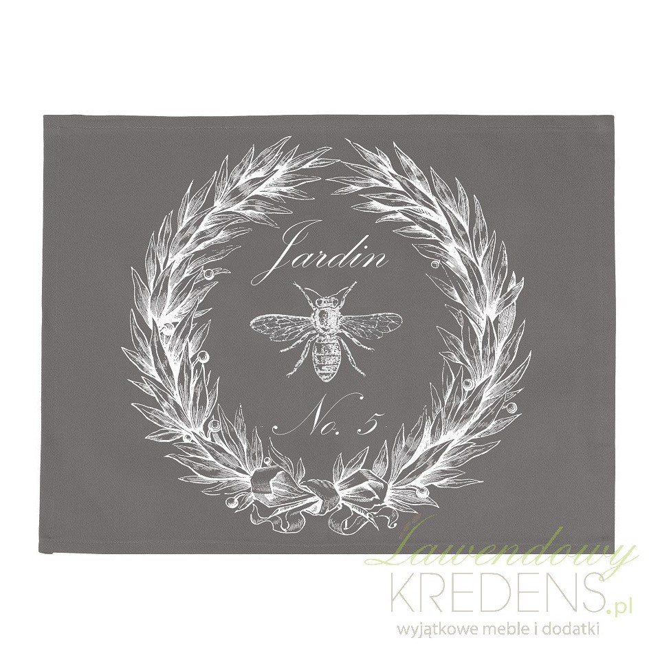 Serweta na stół z motywem wieńca laurowego, z białym nadrukiem na szarym, bawełnianym płótnie. Delikatne wykończenia, prostota formy, stonowane, klasyczne kolory. Idealne do wnętrz surowych jak i ciepłych, klasycznych i nowoczesnych.