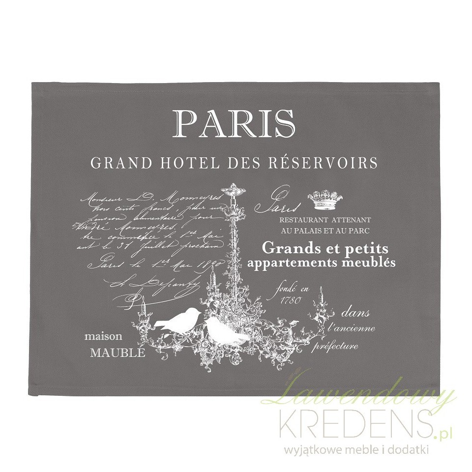 Szare serwety na stół polskiej marki French Home z eleganckim nadrukiem i delikatnymi napisami. Polecamy!