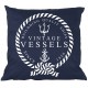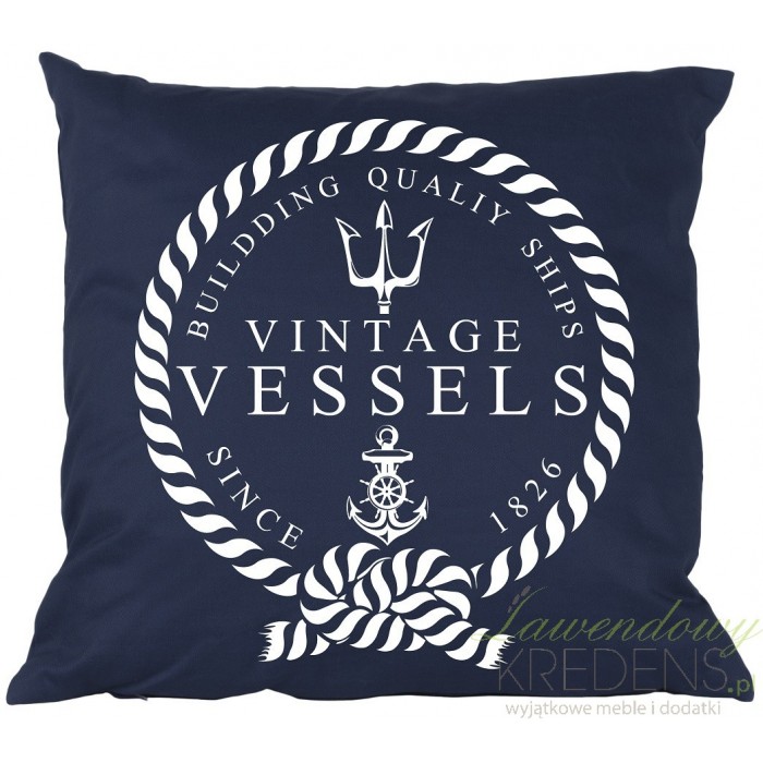 Granatowa poduszka w stylu marynistycznym z okrągłym sznurem, kotwicą i angielskimi napisami!