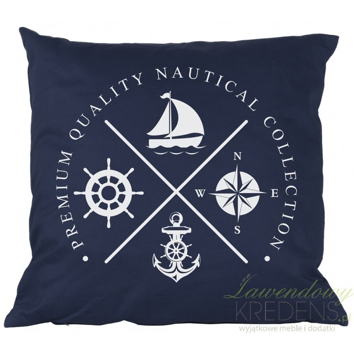Kwadratowa poduszka w stylu marynistycznym wykonana jest ze 100% bawełny. Poduszka jest w kolorze granatowym i na przodzie ma motyw żaglówki, kompasu, kotwicy oraz steru. Dodatkowo wokół uroczych marynistycznych akcentów wystepuje napis w języku angielskim. Poduszki ozdobne np. poduszki marynistyczne są świetnym dodatkiem do wnętrz!